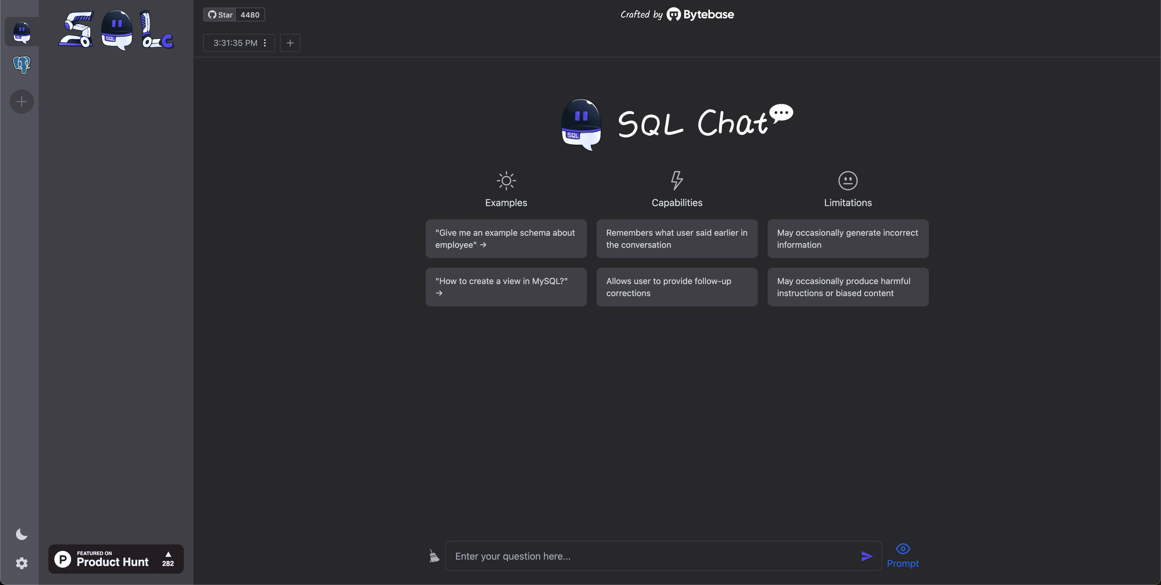 SQL Chat is a chat-based SQL client, which uses natural language to communicate with the database to implement operations such as query, modification, addition, and deletion of the database. Instead of navigating across many UI controls, SQL chat applies a much more intuitive chat-based interface, bringing more flexible and comfortable user experience.